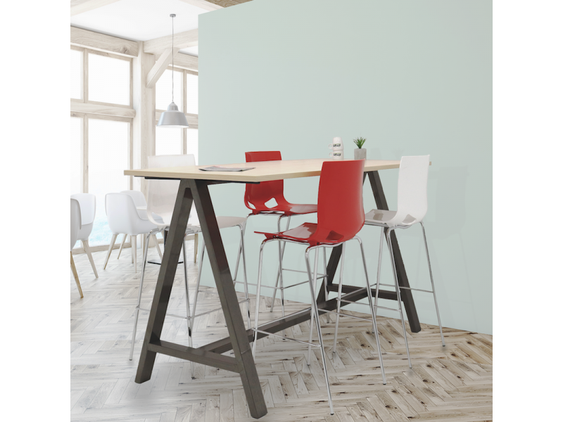 – Stapelbare barkruk – Moderne uitstraling – Zithoogte 78 cm – Leverbaar in wit, oranje, antraciet, paars, rood en groen – Kunststof zitting van 43,5 x 36,5 cm – Het fram is chroomkleurig